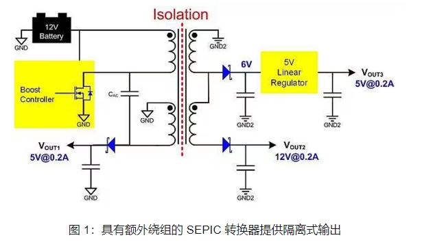 SEPIC 是非隔离式拓扑。不过与反激式拓扑一样,您可以轻松添加额外变压器绕组来产生隔离式输出。图 1 简化原理图显示了一个标准 SEPIC 转换器,该转换器在左侧生成一个非隔离式输出,在右侧额外生成两个隔离式输出。第一个隔离式绕组提供标称 6V 输出,作为 5V 线性稳压器的输入。第二个隔离式绕组堆叠在第一个绕组之上,产生非稳压 12V 输出。