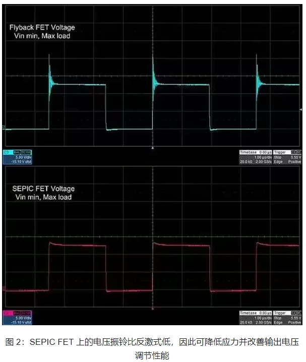 图 2 显示了 SEPIC 和反激式转换器之间的 FET 电压振铃差异。只需移除 CAC 即可从 SEPIC 电路获得反激式 FET 电压波形,从而将其转换为反激式电路。消除 FET 上的振铃可显著降低传导到隔离式输出的非耦合能量,从而改善调节性能。