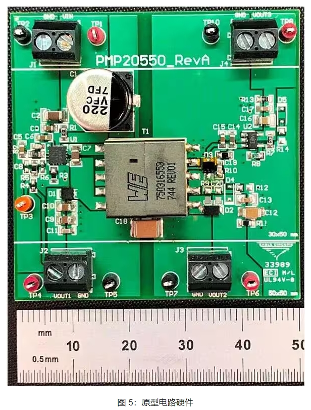 图 3 显示了用于获取图 4 中调节数据的测试电路原理图,而图 5 显示了实际硬件的照片。此设计使用初级侧反馈在 VOUT1 上实现稳定电压。隔离式输出依赖于变压器紧密耦合和小型预负载的组合来获得合理的电压调节。由于线性稳压器保持隔离式 5V 输出恒定,因此其最小和最大输入是首要问题。如果线性稳压器的输入过低,则输出电压会下降。相反,如果线性稳压器的输入过高,则将消耗过多功率。