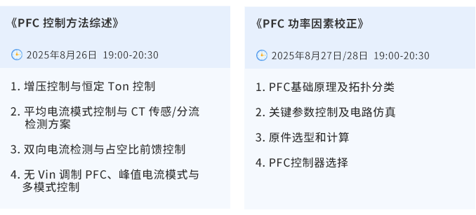 搜索关注“电源工程师技术培训网”微信公众号即可获得最新消息。本次直播培训为电源授证项目系列培训 - 功率因数校正(PFC)设计注意事项。本次直播将带您全面了解功率因数校正(PFC)技术中的各类常用控制方法。我们将深入浅出地讲解每种控制策略的基本原理,包括它们如何影响电路性能与效率。同时,直播中还将对比分析各种方法的优缺点,帮助您理解其适用场景与设计考量。欢迎准时观看,共同探讨PFC技术的奥秘!